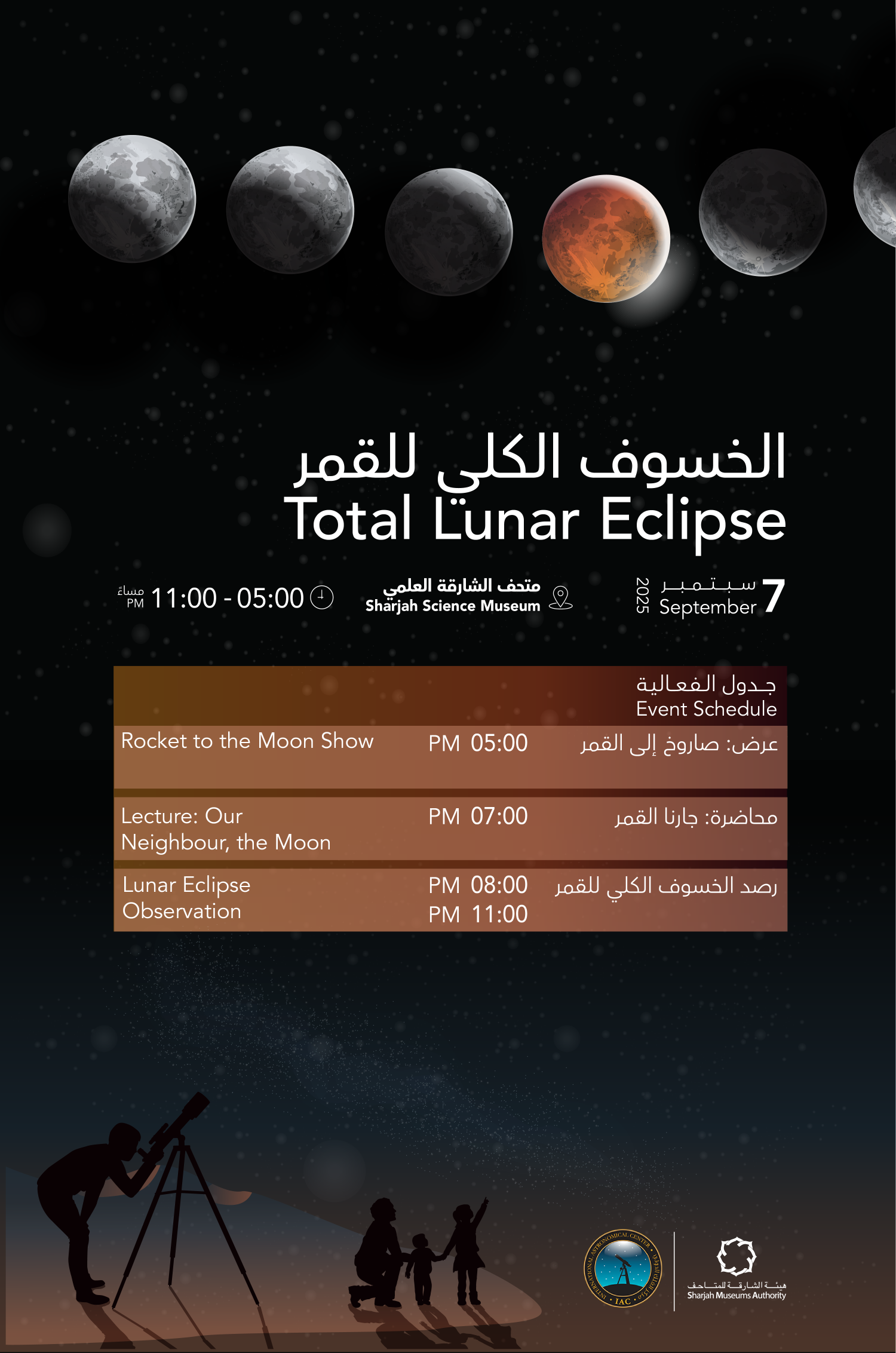 Sharjah Museums Authority is pleased to invite the public to take part in an exceptional astronomical experience organized by Sharjah Science Museum, to observe the total lunar eclipse using the latest specialized telescopes, along with engaging astronomy activities that aim to enhance knowledge of the Moon’s surface and understanding of celestial phenomena.
